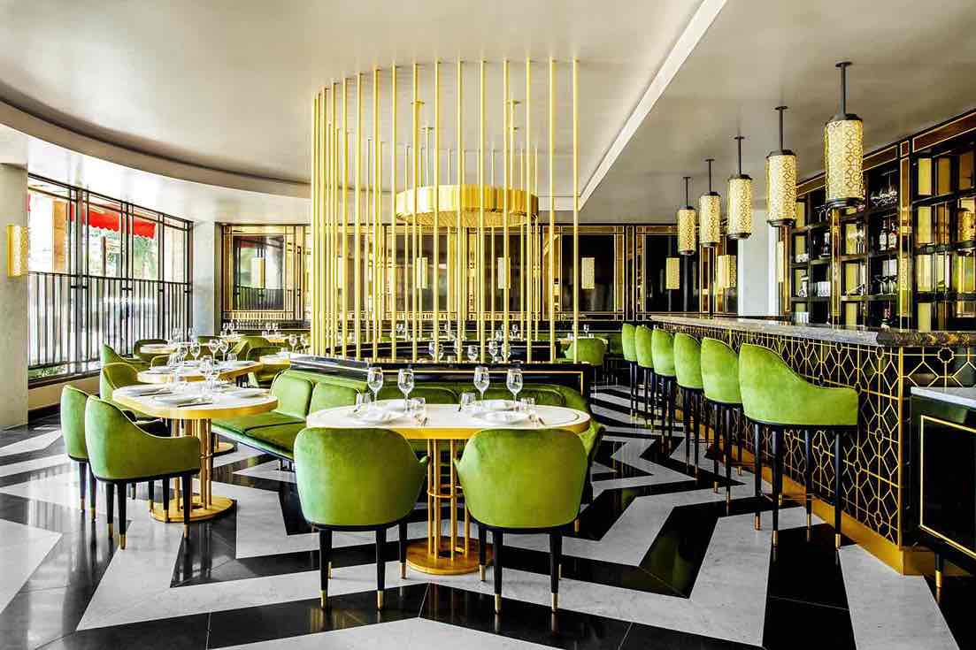 - Le cadre ne laisse pas le décor en deuxième plan : la décoration intérieure contribue à l’identité forte du lieu. L’étoile du sol (logo Song Qi), le sol en damier noir-blanc, le contraste entre le marbre noir et les banquettes vertes en velours, les luminaires dorés : chaque détail vise à créer une atmosphère intemporelle et immersive.